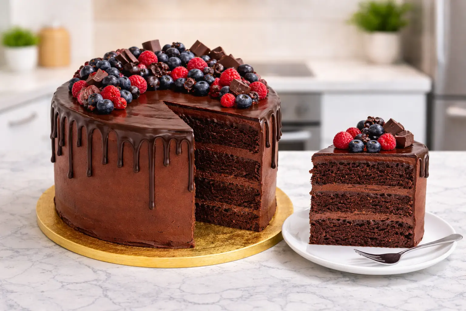Bizcocho de chocolate oscuro, relleno cremoso central y cobertura intensa con textura equilibrada en cada capa. Una tarta pensada para quienes prefieren el chocolate con profundidad real, no exceso de azúcar.